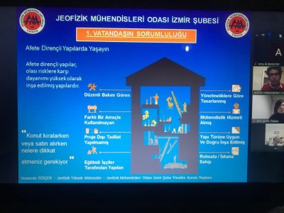1-7 Mart Deprem Haftası etkinlikleri kapsamında Şubemiz ve Türk Kadınlar Birliği ile birlikte düzenlenen etkinlikte, Şube Başkanı Sinancan ÖZİÇER tarafından "Afetlere Karşı Alınacak Önlemler" konulu sunum çevrimiçi yapılmıştır.