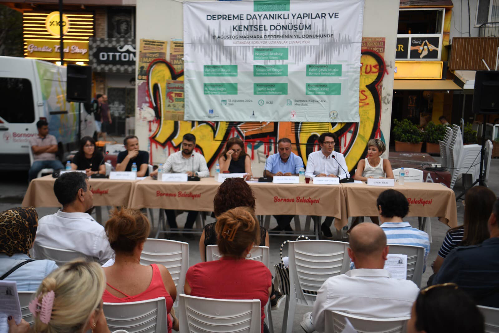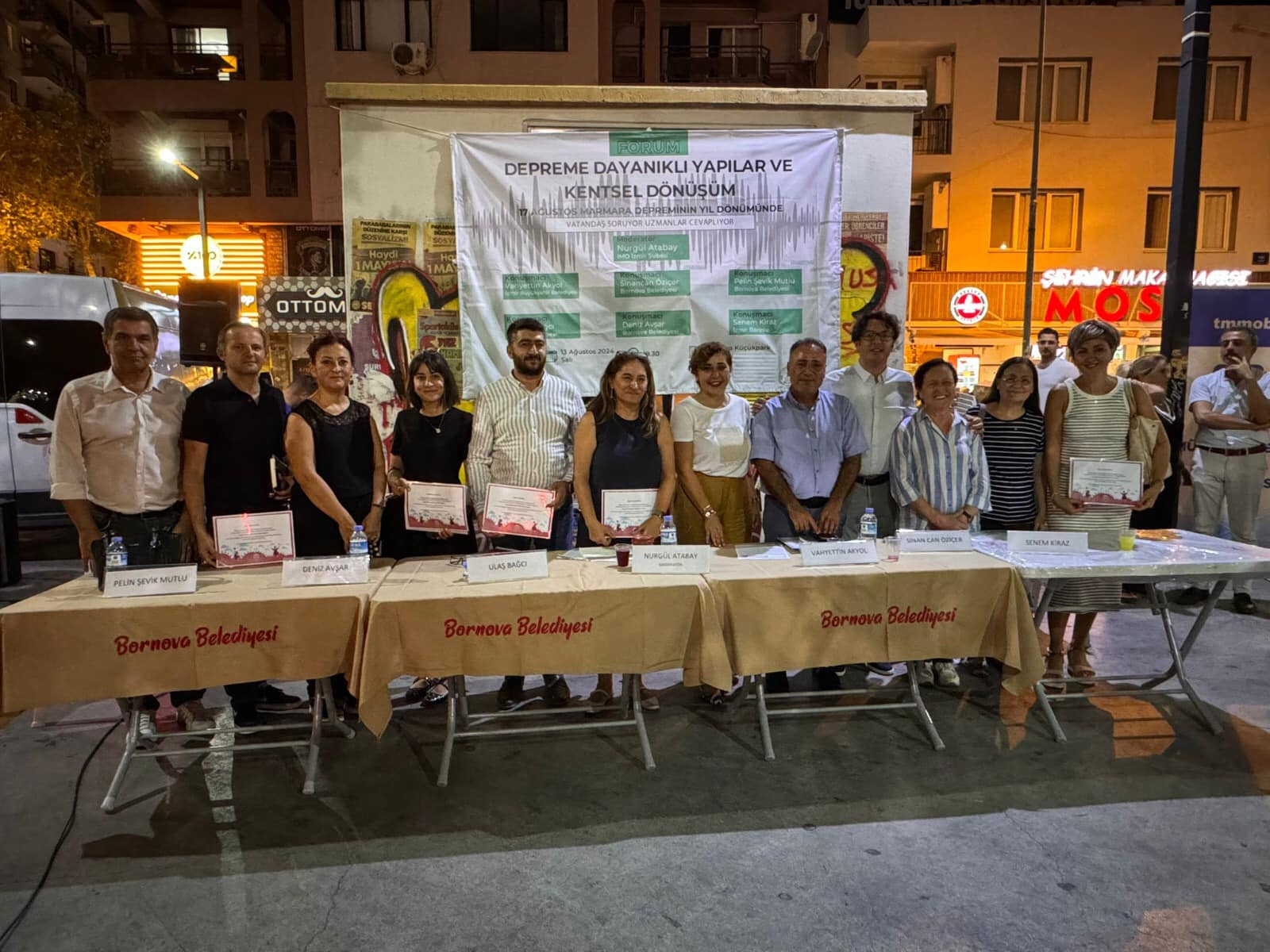 İnşaat Mühendisleri Odası ve Bornova Belediyesi tarafından 17 Ağustos Marmara Depreminin yıldönümünde “Depreme Dayanıklı Yapılar ve Kentsel Dönüşüm” Forumu düzenlenmiştir. Vatandaşa soru cevap şeklinde yapılan forumda Şube Başkanı Sinancan ÖZİÇER afetlere karşı korunma yöntemleri ile ilgili bilgi vermiş, açıklamalarda bulunmuştur. Vatandaşlar tarafından sorulan sorulara cevap vermiştir.
