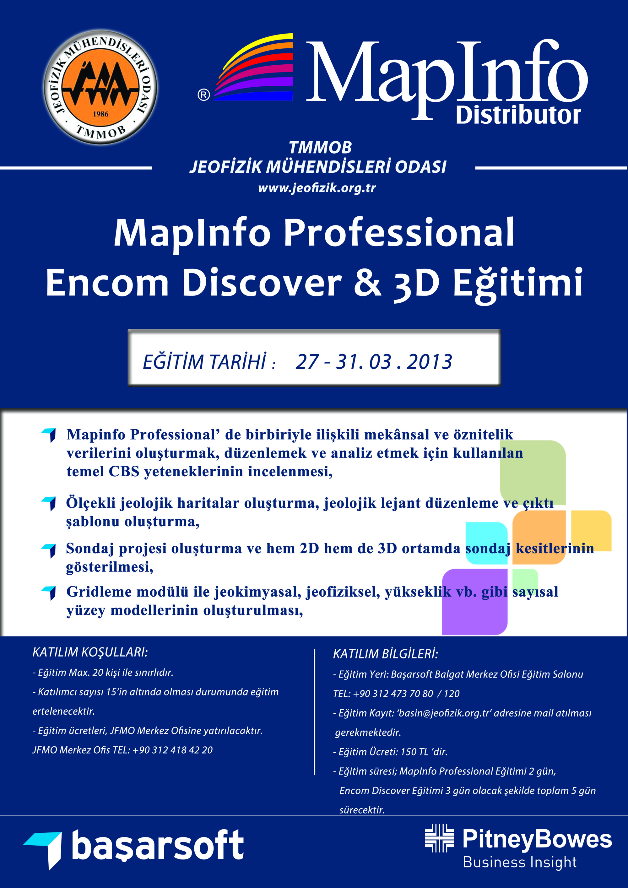 TMMOB Jeofizik Mühendisleri Odası ve Başar Bilgisayar Sistemleri ve İletişim Teknolojileri San. ve Tic. Ltd. Şti. (Başarsoft) işbirliğinde "MapInfo Professional Temel ve İleri Seviye Eğitimi (2 gün) ile Encom Discover & Discover 3d Yerbilimleri Uygulamaları Eğitimi (3 gün)" 27-31 Mart 2013 tarihlerinde (5 gün) Ankara‘da verilcektir.
